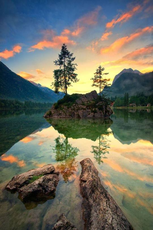 July 29, 2014 640 × 960 tree sunset mountains reflected in pool of water